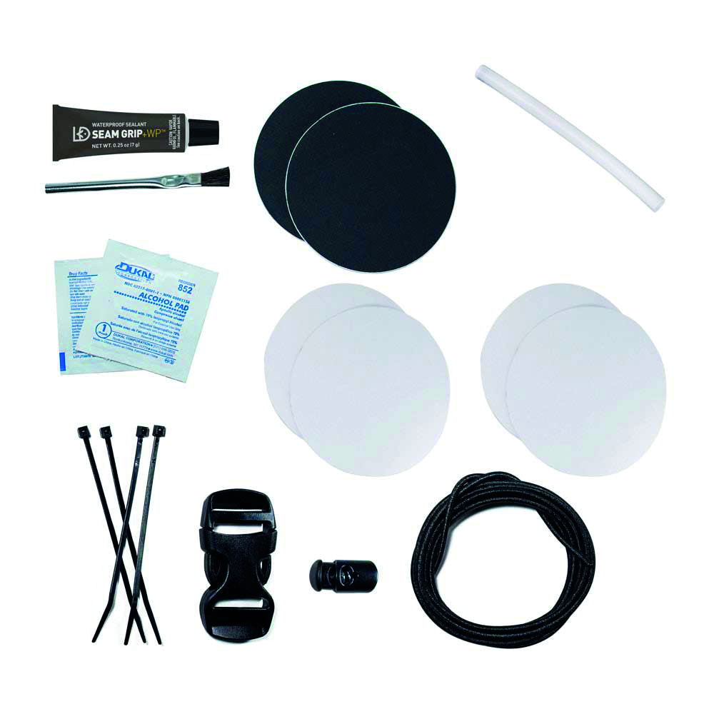 Le kit comprend : 4 patchs adhésifs transparents Tenacious Tape (ronds de 7,6 cm), 2 patchs adhésifs noirs en nylon Tenacious Tape (ronds de 7,6 cm), du mastic Seam Grip WP (7 g), un pinceau applicateur, des lingettes alcoolisées, un bâton thermofusible, des serre-câbles, une boucle à double réglage de 25 mm, un bloque-cordon Ellipse, 2 m de cordon élastique et un mode d’emploi.
